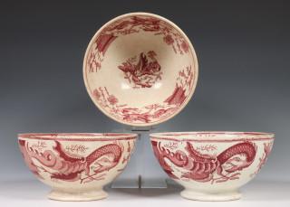 Petrus Regout Maastricht, drie aardewerk kastkommen, decor Dragon.