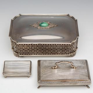 langwerpige doos met gecontourneerde hoeken en ajour zijkant, op deksel grossulaar cabochon met rood fluwelen interieur, gemerkt 800 en onduidelijk keur, 3e gehalte, de lepeldoos is aangepaste tabaksdoos met mt. Hendrik Kuijenburg 1842 Schoonhoven, snuifdoosje met later toegevoegde pootjes, met meesterteken (onduidelijk )1849,