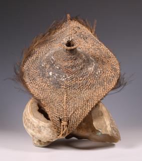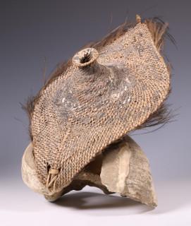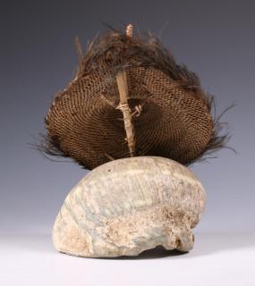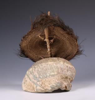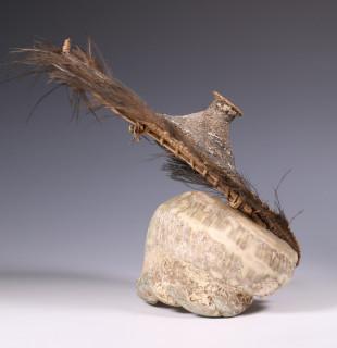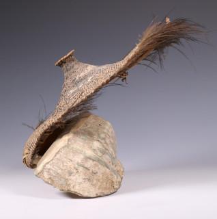 consisting of a shell with a braided mounted panel with cassowary feathers.