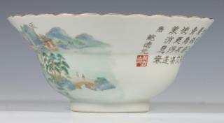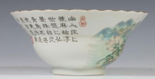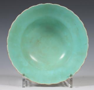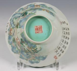 China, famille verte lobed 'landscape' bowl, 19th century, the exterior decorated with pavillions in a mountainous landscape, with inscription, the interior covered with a turquoise glaze, the base with Jiaqing six-character seal mark