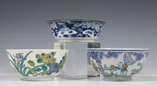 een blauw-witte kom gedecoreerd met feniksen, een famille verte kom met jongetjes en apocrief Qianlong merk en een famille verte kom met prunus en chrysant (defecten)
