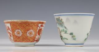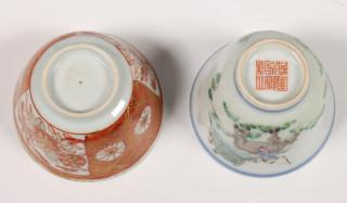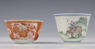 China, famille rose porcelain teabowl and an Imari porcelain teabowl, 18th-19th century, the famille rose bowl decorated with a boy on a waterbuffalo, the base with Daoguang seal mark, the Imari bowl with flowers