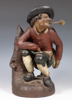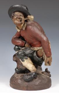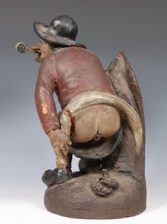 Voorstellende 'kakkertje'. Gehurkte figuur met hoed en Goudse pijp in de mondhoek.