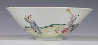 China, famille rose porcelain 'festival' bowl, 20th century, decorated with a procession of boys playing musical intruments, with four-character mark