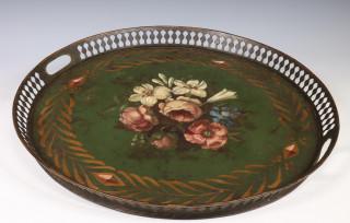 Uitgevoerd met decoratie van rozen op groen fond, ajour gezaagde galerij.