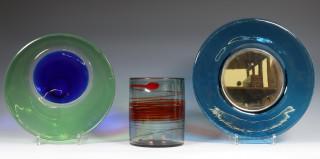 Gesigneerd en gedateerd 1962. Hierbij een glazen schaal ontwerp Ladislav Palecek voor Beranek, ca. 1970 en een blauw glazen schaal met spiegel, Pukeberg.