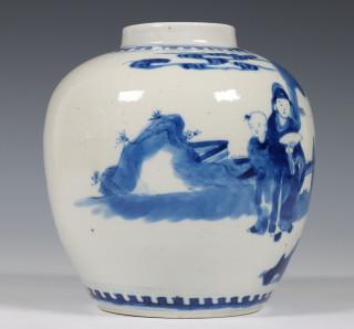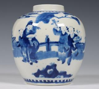 China, blue and white porcelain bowl, ginger jar and saucer, Wanli period and later, the bowl decorated in the typical Wanli style, the ginger jar with boys in a fenced garden, apocryphal Kangxi mark, the saucer with boy in garden (Wanli bowl damaged)