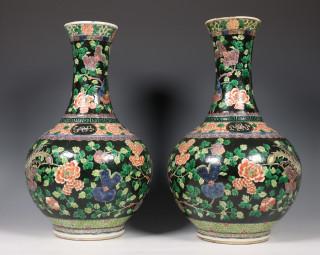 China, paar famille verte porseleinen zwartgegronde vazen, 20e eeuw,