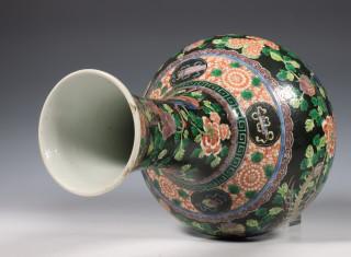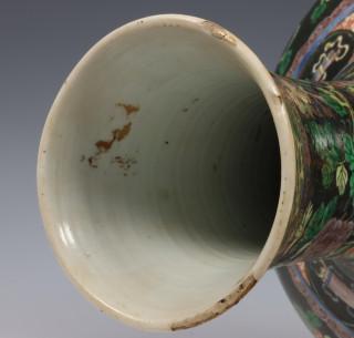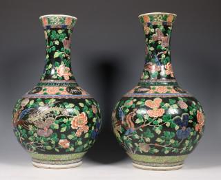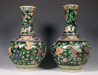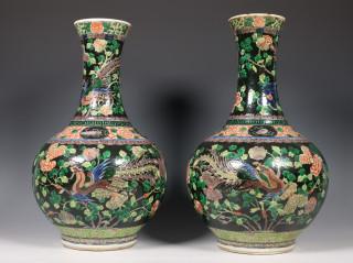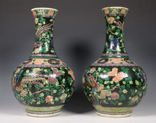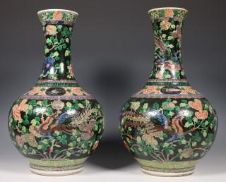 China, pair of famille verte porcelain black-ground vases, 20th century, each decorated with phoenixes amidst chrysanthemum, with apocryphal Qianlong marks (damage and repair to rims), provenance: Dutch private collection