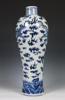 China, blue and white porcelain 'dragon' vase, 19th-20th century, the baluster vase decorated with two dragons contesting the flaming pearl (frits, chips, firing cracks), provenance: Dutch private collection