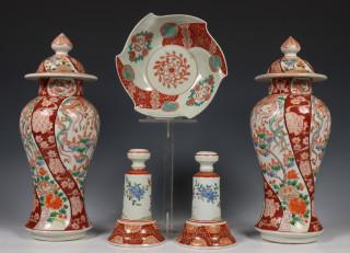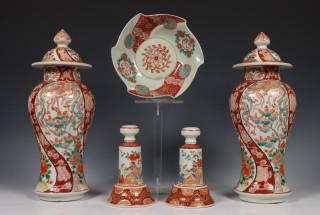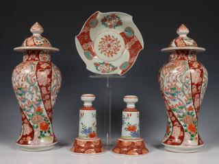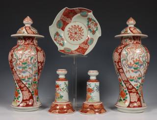 bestaande uit een paar baluster dekselvazen, een paar kandelaars en een kom, alle gedecoreerd met vogels en bloemen (een deksel met chips)