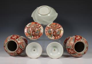 Japan, collection of Kutani porcelain, 19th-20th century, comprising a pair of baluster vases and covers, a pair of candlesticks and a bowl, all decorated with flowers and birds (one cover chipped), provenance: Dutch private collection