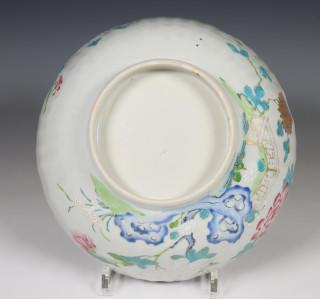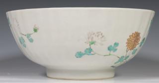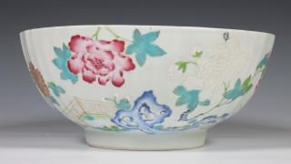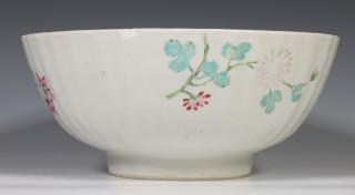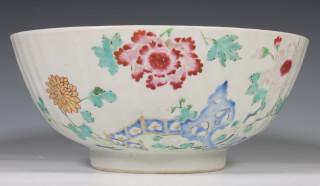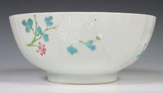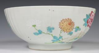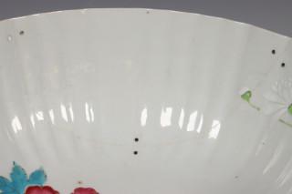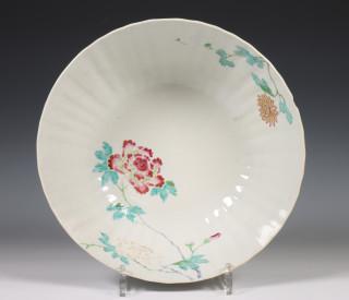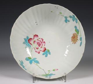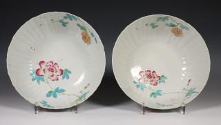 China, pair of famille rose porcelain ribbed bowls, 18th century, modelled with ribbed sides and decorated with chrysanthemum an peony (both restored), provenance: Dutch private collection