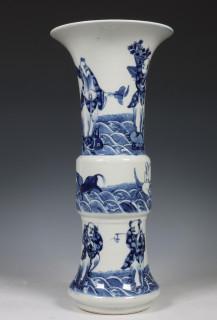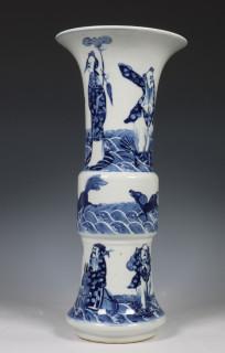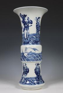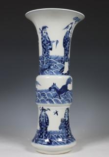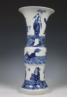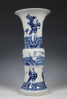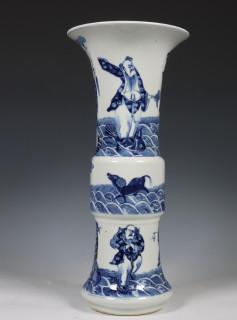 China, blue and white porcelain trumpet vase, 20th century, decorated with the Immortals standing on sea creatures in the waves, apocryphal Kangxi mark (hairline), provenance: Dutch private collection