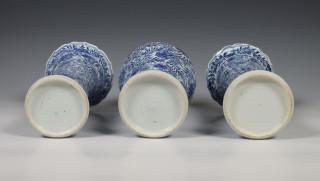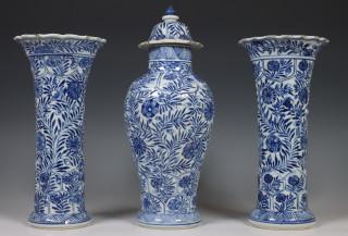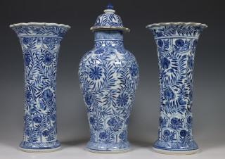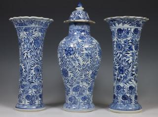 China, three part blue and white porcelain garniture, Kangxi, comprising a pair of trumpet vases and a baluster vase and cover, painted with flower scrolls (cover damages, rim chips and frits), provenance: Dutch private collection