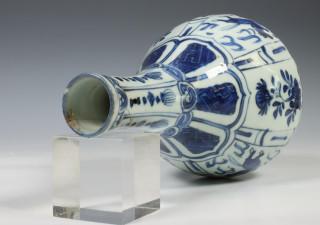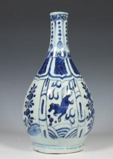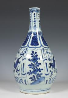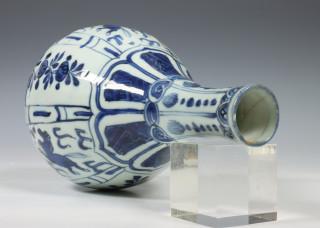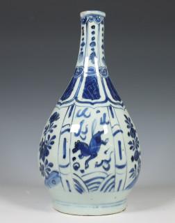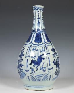 China, blue and white 'kraak' porcelain bottle vase, Wanli, the pear-shaped body decorated with panels of flying horses and flowers (neck repaired, chip), provenance: Dutch private collection