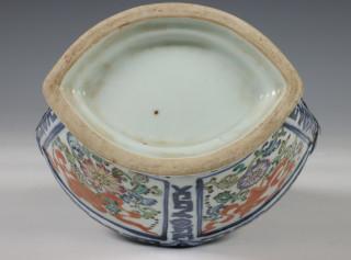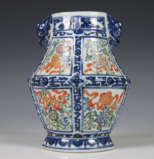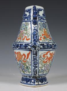 China, famille rose porcelain vase, 20th century, navette shaped, decorated with panels with buddhist symbols, with two mask handles (frits), provenance: Dutch private collection