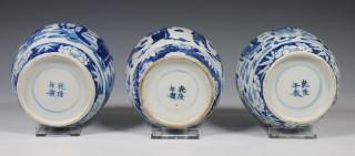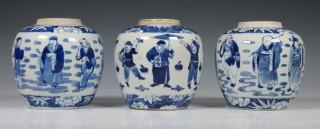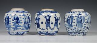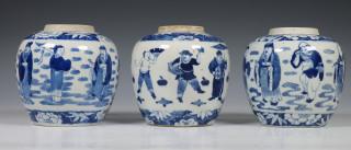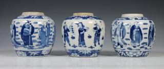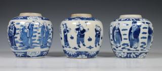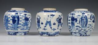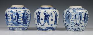 China, a pair and a single blue and white porcelain ginger jar, 19th century, the pair decorated with the Eight Immortals, the single one with children (covers lacking), provenance: Dutch private collection