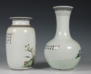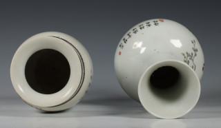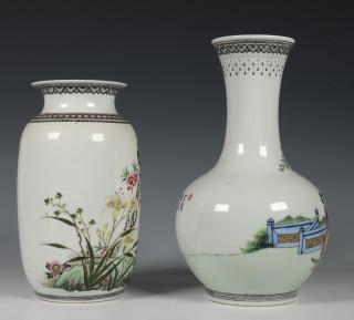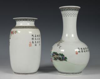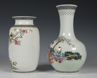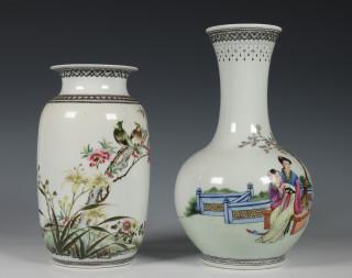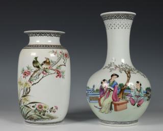 China, two famille rose porcelain vases, modern, one decorated with birds on a flowering branch, the other with lady and boys in a garden, with apocryphal seal marks, provenance: Dutch private collection