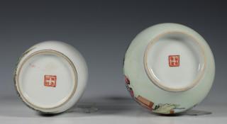 een gedecoreerd met vogels op bloesemtak, de ander met een dame en jongens in een tuin, met apocriefe zegelmerken