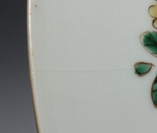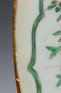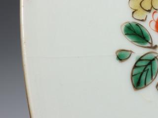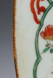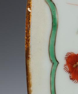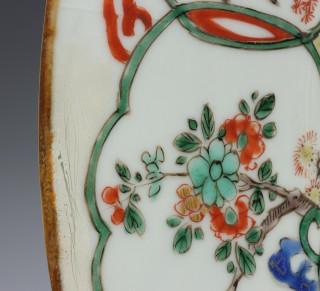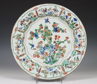 China, famille verte porcelain dish, Kangxi mark and period, decorated with flowers, the rim with cartouches enclosing birds and flowers (restorations, hairline), provenance: Dutch private collection