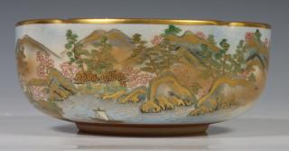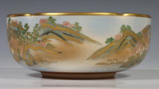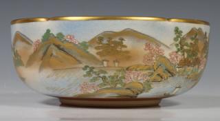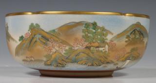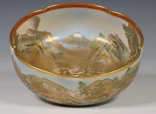 Japan, Satsuma porcelain bowl, 20th century, decorated to the interior with pavilion with mount Fuji in the background, the exterior with a mountainous river landscape, provenance: Dutch private collection