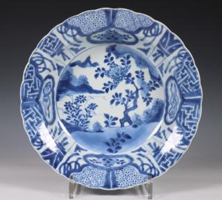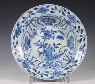 China, two blue and white porcelain dishes, Wanli and later, both decorated with flowers and panels of peach and antiquities (small damages to the rim), provenance: Dutch private collection