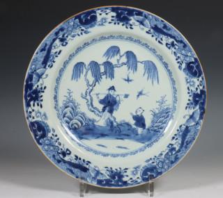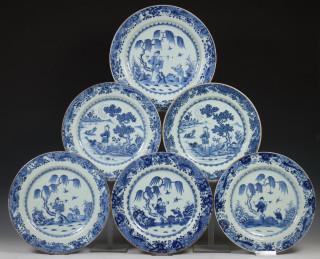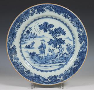China, collection of blue and white porcelain dishes, Qianlong, comprising a pair decorated with fisherman, three with Magu and a larger one with Magu (small rim damages), provenance: Dutch private collection
