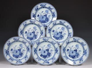 China, blue and white porcelain part dinner service, 19th/20th century, decorated with a lotus pattern, comprising six deep plates, two deep dishes, two dishes and a plate (rim damages and cracks), provenance: Dutch private collection