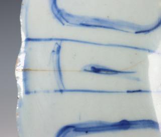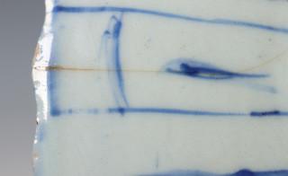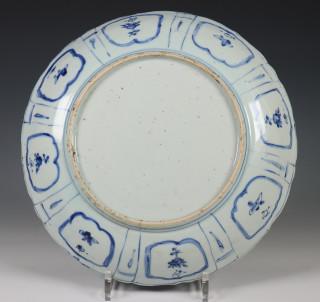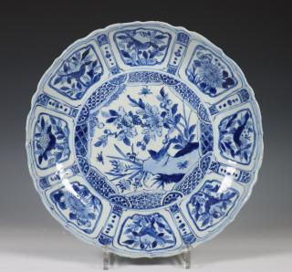 China, blue and white porcelain dish, Wanli, decorated with a bird seated on a rock, surrounded by panels of flowers, peach and pomegranate (cracks), provenance: Dutch private collection