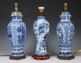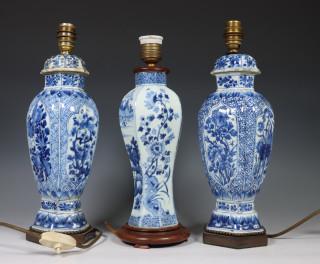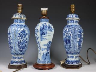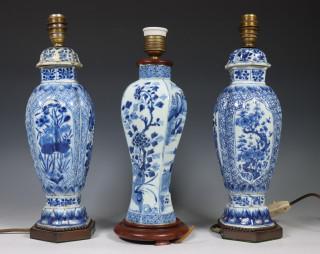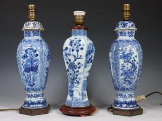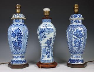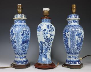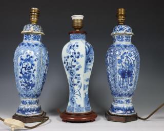 China, pair of blue and white porcelain vases mounted as lamps, Kangxi, with moulded sides and painted with flowers, together with an octagonal vase mounted as lamp (restorations), provenance: Dutch private collection