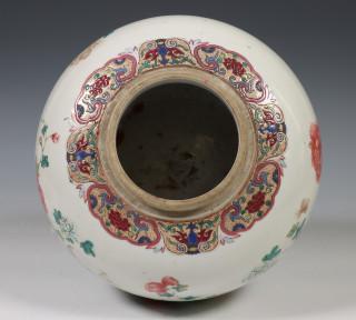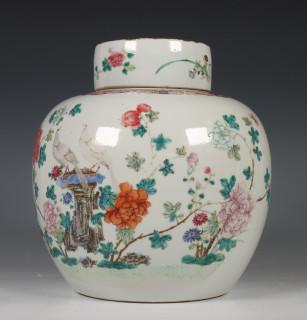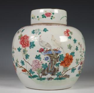 China, famille rose porcelain ginger jar and cover, late Qing dynasty, decorated with birds in a flower-garden (frits), provenance: Dutch private collection