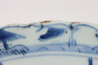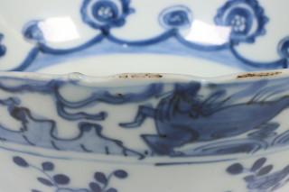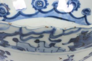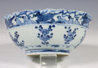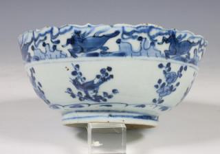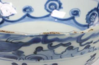 China, blue and white porcelain bowl, late Ming dynasty, decorated with flowers below a band of flying horses (rim frits), provenance: Dutch private collection