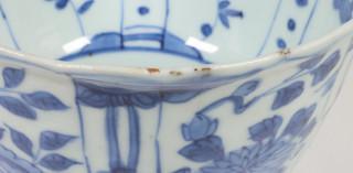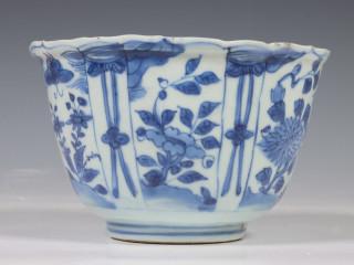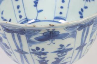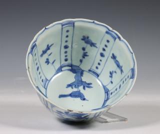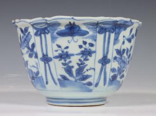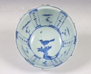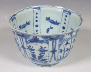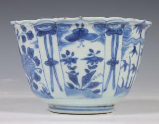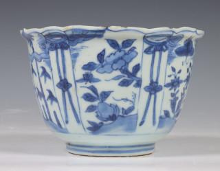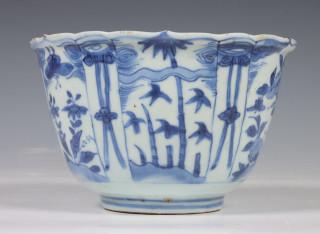 China, blue and white porcelain tall bowl, Wanli, the exterior decorated with floral panels, the interior with a bird (rim chip, frits), provenance: Dutch private collection