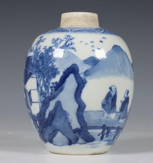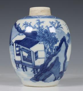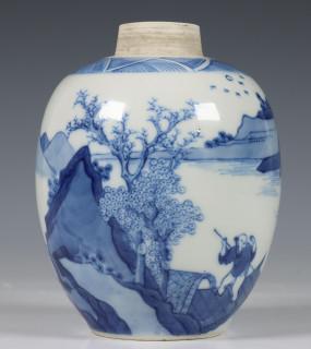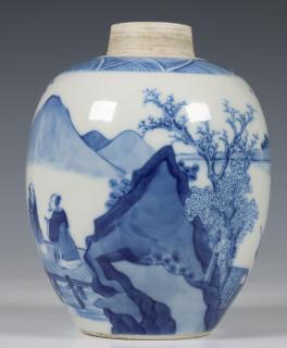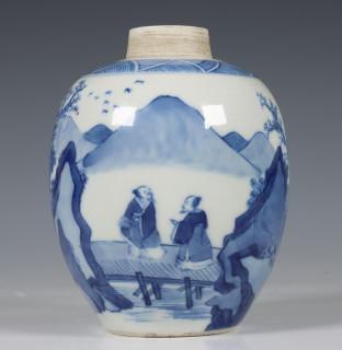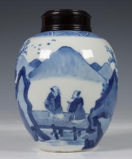 China, blue and white porcelain teacaddy, 19th century, decorated with figures crossing a bridge in a river landscape, with wood cover (small rim chip), provenance: Dutch private collection