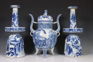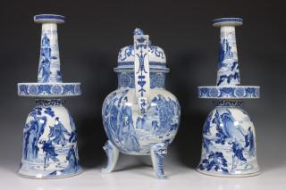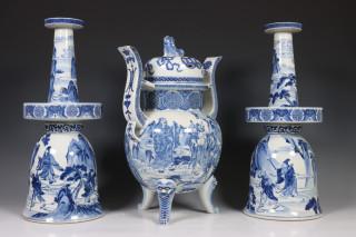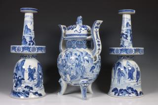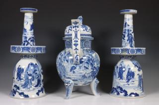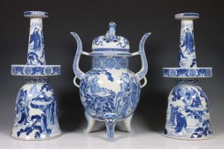 China, blue and white altar set, 19th century, comprising a pair of conical incense holders and a censer, each painted with figures and shou-symbols (some small chips), provenance: Dutch private collection