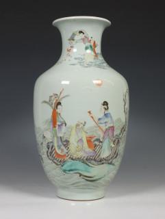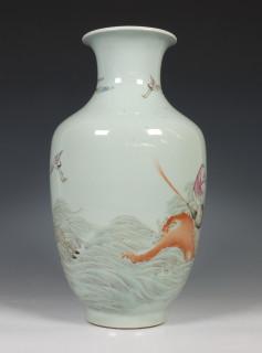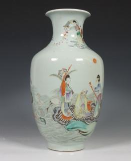 China, famille rose porcelain 'Shoulao and Liu Hai' vase, 19th/20th century, decorated with Shoulao on a raft, his deer and Liu Hai with his toad on a gourd beside him, provenance: Dutch private collection