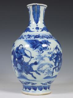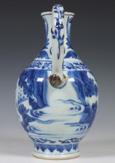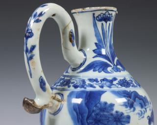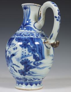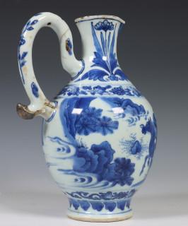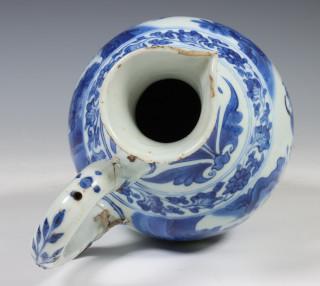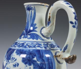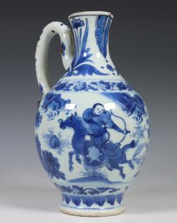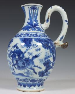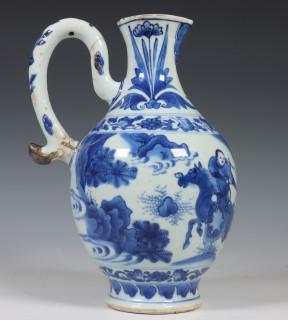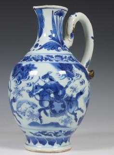 China, blue and white porcelain Transitional ewer, mid 17th century, decorated with equestrian hunters, the neck with stylised tulips (handle repaired, chips and frits), provenance: Dutch private collection