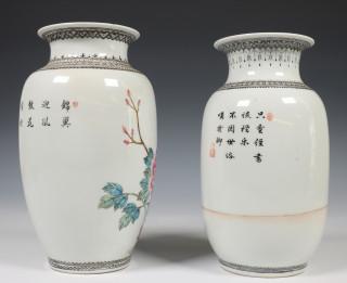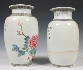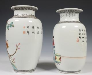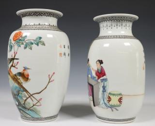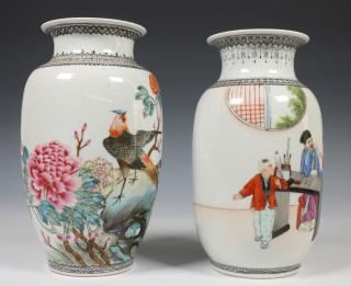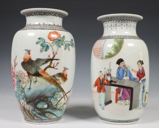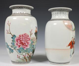 China, two famille rose porcelain vases, modern, one decorated with pheasants, the other with a scholar at his writing table (one chip), provenance: Dutch private collection