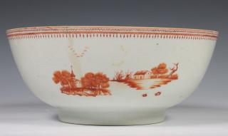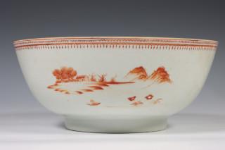 China, iron-red decorated bowl, 18th century, decorated in Meissen style with landscapes (restored crack and chip), provenance: Dutch private collection