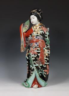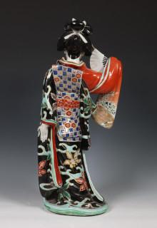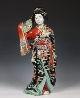 Japan, Imari figure of a geisha, 19th/20th century, dressed in a kimono decorated with leaves, obi, with fan and hair ornaments (repair), provenance: Dutch private collection