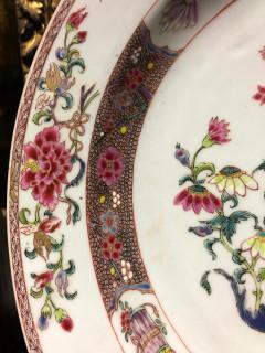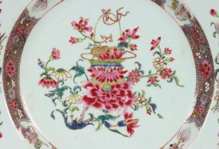 China, famille rose porcelain dish, Qianlong, decorated with lotus and flower basket, provenance: Dutch private collection