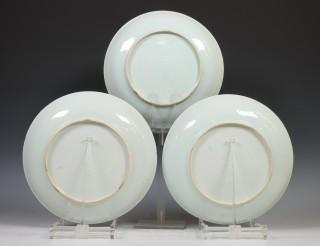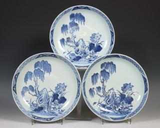 China, collection of blue and white porcelain dishes, 18th century, comprising a set of three dishes decorated with willow and lotus and three variously decorated dishes (some small damages to the rim), provenance: Dutch private collection