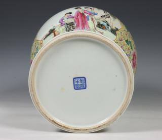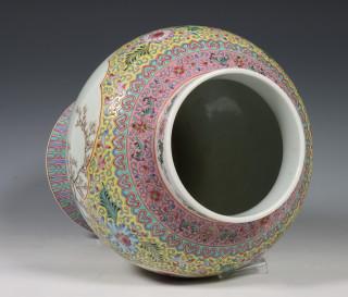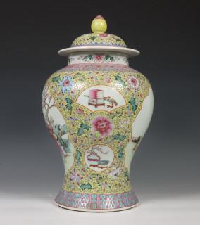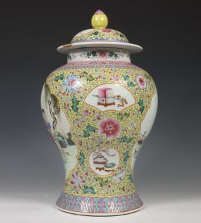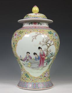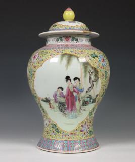 China, famille rose porcelain vase and cover, 20th century, decorated with panels with ladies, on a yellow floral ground, with apocryphal Qianlong mark (cover damaged), provenance: Dutch private collection