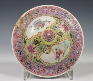 gedecoreerd met panelen met dames, op een gele grond met bloemen, met apocrief Qianlong merk (deksel beschadigd)