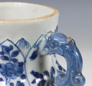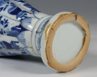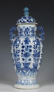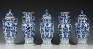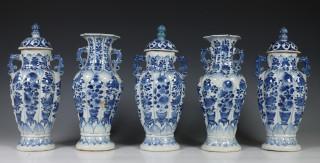 China, five-part blue and white porcelain garniture, Kangxi, comprising a set of three baluster vases and covers and a pair of trumpet vases, each modelled with floral panels and with two dragon handles, painted with flowers (damages and finial restored), provenance: Dutch private collection
