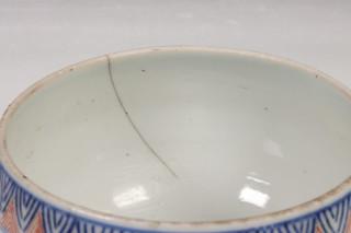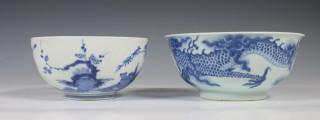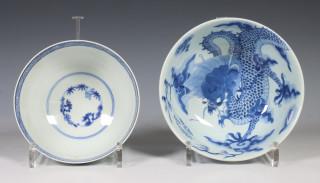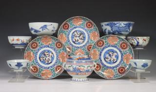 bestaande uit een set van drie bordjes met draken en feniks, een dekselkom met landschap, vier blauw-witte kommen, waaronder een met draak, en twee florale kommen (dekselkom en drakenkom met barst)