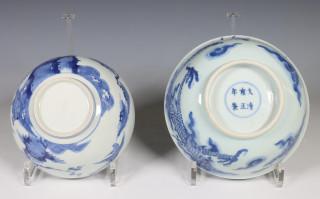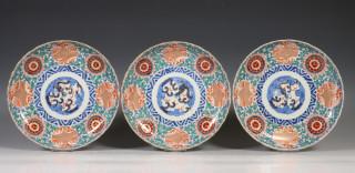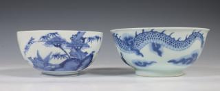Japan, collection of blue and white and Kakiemon-style porcelain, 19th-20th century, comprising a set of three plates with dragons and phoenix, a bowl and cover with landscape, four blue and white bowls, one of which with dragon, and two floral bowls (bowl and cover and dragon bowl with crack), provenance: Dutch private collection