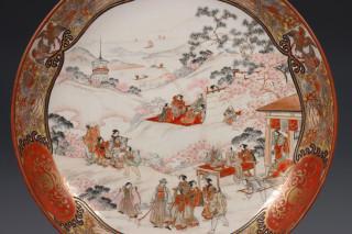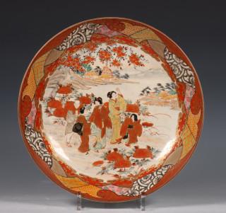 Japan, four Kutani porcelain dishes, 19th century, comprising a pair of dishes painted with ladies dancing below the cherry blossom and two dishes variously decorated with figures in a landscape (star crack, restoration), provenance: Dutch private collection