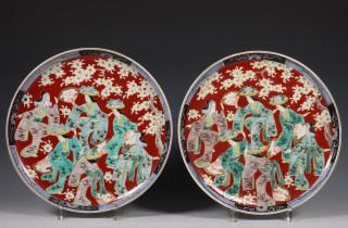 bestaande uit een paar schotels beschilderd met dansende vrouwen onder de kersenbloesem en twee schotels verschillend gedecoreerd met figuren in een landschap (sterbarst, restauratie)